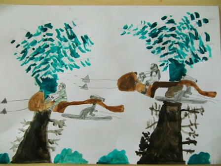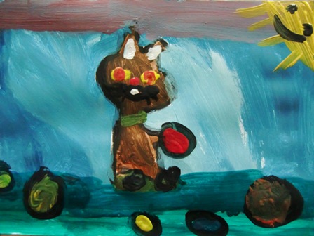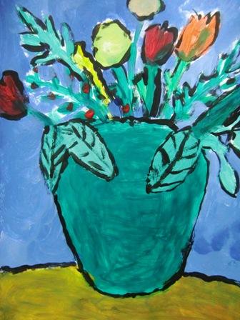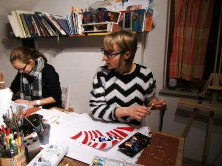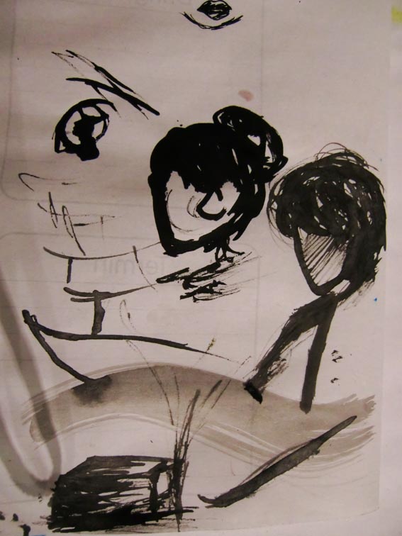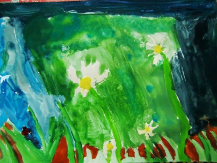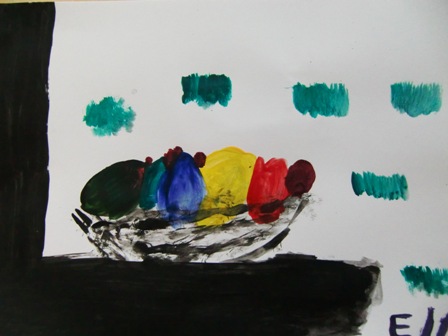 Mit Vergnügen hantieren und probieren sie mit Stiften, Pinseln und Farben. Ihr Gestalten ist gefühlsnah und spontan.